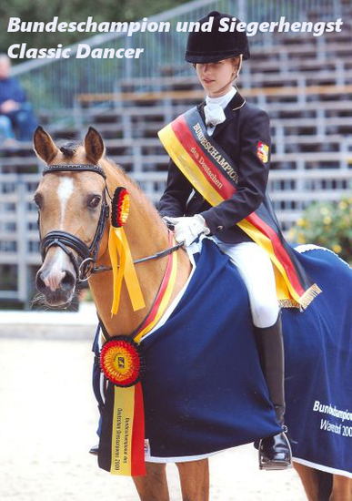 MMV.: Golden Dancer - mehrf. Landeschampion / EM siegr. Pony DRE / mehrf. pl. EM + DM Pony DRE / siegr. bis DRE S / 21 gek. Söhne / 45 StPrSt / 114 sporterfolgr. NK bis DRE S u.a. Der kleine Gigolo - DRE S, Golden Boy - DRE M, Genial - DRE S, Golden Dream R - DRE M, FS German Dancer - DRE M